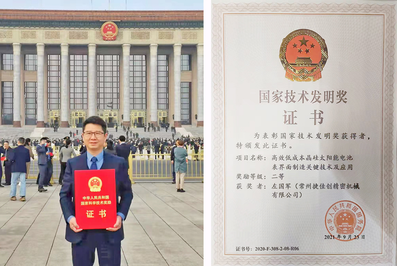 2021年11月3日,2020年度國(guó)家科學(xué)技術(shù)獎(jiǎng)勵(lì)大會(huì)在北京人民大會(huì)堂隆重舉行。習(xí)近平、李克強(qiáng)、王滬寧、韓正等黨和國(guó)家領(lǐng)導(dǎo)人出席大會(huì)并為獲獎(jiǎng)代表頒獎(jiǎng)。由江蘇大學(xué)、天合光能、常州大學(xué)和常州捷佳創(chuàng)協(xié)同創(chuàng)新、聯(lián)合攻關(guān)的“高效低成本晶硅太陽(yáng)能電池表界面制造關(guān)鍵技術(shù)及應(yīng)用”項(xiàng)目榮獲國(guó)家技術(shù)發(fā)明獎(jiǎng)二等獎(jiǎng),這是國(guó)家對(duì)光伏制造領(lǐng)域重大原理創(chuàng)新及技術(shù)突破的充分肯定,是光伏領(lǐng)跑新能源,推動(dòng)“雙碳”目標(biāo)大跨步前進(jìn)的重大榮譽(yù)。