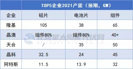 再以TOP5組件企業(yè)為例,各大龍頭紛紛補足短板,夯實一體化基礎。其中一體化最為均衡的為晶澳科技,硅片、電池產(chǎn)能保持為組件產(chǎn)能的80%。