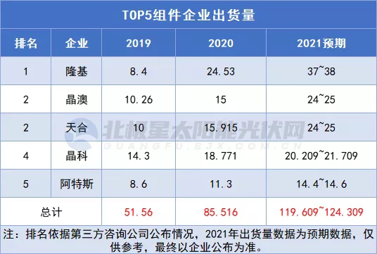 梳理2017-2021年連續(xù)5年全球組件出貨量排名,TOP5企業(yè)巋然不對,僅排序略有變化。2019年,TOP5企業(yè)即隆基、晶科、天合、晶澳、阿特斯5家企業(yè)組件總出貨量51.56GW,2020年這一數(shù)字增長至85.5GW,而2021年再攀高峰突破120GW。據(jù)BNEF彭博新能源財經(jīng)預測,2021年全球光伏新增裝機或達183GW。這也意味著TOP5組件企業(yè)的市場占比達到六成以上。