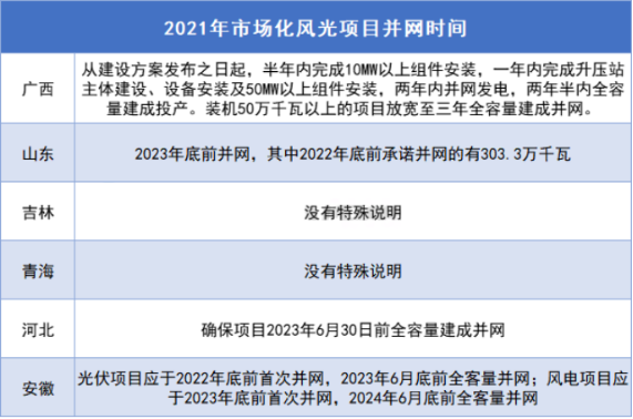 2021年青海、山東、河北、廣西、吉林、安徽6省下發(fā)了約83GW的市場化并網(wǎng)風(fēng)光項目,但并網(wǎng)時間大多集中于2023年,僅山東10GW項目中有3.03GW項目承諾于2022年底前并網(wǎng)。