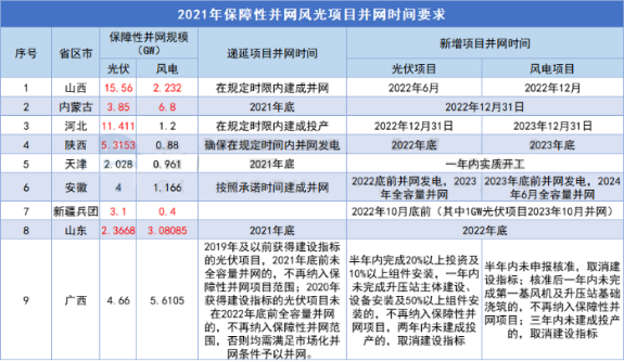 保障性項目并網(wǎng)時間,各省要求不同,其中遞延項目,即2019年、2020年獲得指標(biāo)未并網(wǎng)的項目,除廣西外均要求在2021年底并網(wǎng),廣西對于2020年獲得指標(biāo)的光伏項目并網(wǎng)節(jié)點延長至2022年底。而新增項目,山西、內(nèi)蒙古、山東及新疆兵團(tuán)要求風(fēng)光項目于2022年底并網(wǎng),河北、陜西光伏項目須于2022年底并網(wǎng),風(fēng)電項目須于2023年底并網(wǎng)。此外,廣西風(fēng)、光項目的并網(wǎng)時長分別為兩年、三年,天津僅要求一年內(nèi)實質(zhì)開工,安徽光伏、風(fēng)電項目的全容量并網(wǎng)時間節(jié)點分別為2023年、2024年。