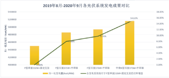 該項(xiàng)目采用中來(lái)N型TOPCon組件,與另外兩家主流廠家P型PERC組件做發(fā)電量實(shí)證對(duì)比,統(tǒng)計(jì)發(fā)電量時(shí)間為2019年8月至2020年9月,結(jié)果顯示,同樣采用平單軸支架的情況下,N型TOPCon組件發(fā)電能力比兩家PERC組件分別高出4.87%和6.65%,發(fā)電量增益顯著。