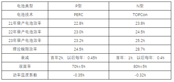 N型TOPCon組件具有四大優(yōu)勢(shì),兩高兩低:高效率、高雙面率、低衰減、低功率溫度系數(shù),我們與P型PERC組件做一比較如下: