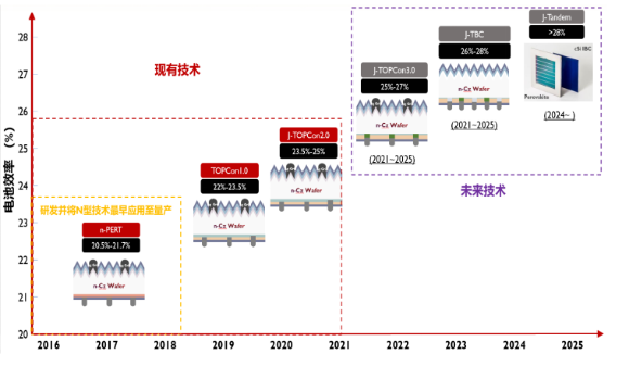 TOPCon技術(shù)擁有著完整的可持續(xù)發(fā)展的技術(shù)路線支撐,未來(lái)的迭代升級(jí)空間廣闊,預(yù)計(jì)2024-2025年實(shí)現(xiàn)與IBC技術(shù)的結(jié)合,形成TBC技術(shù),量產(chǎn)效率可達(dá)26%-28%,“十五五”期間實(shí)現(xiàn)與鈣鈦礦的疊層電池量產(chǎn),將量產(chǎn)電池效率推高到28%以上。