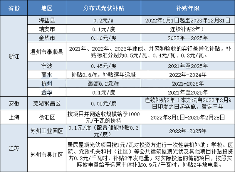 值得關(guān)注的是,2022年光伏進入全面無補貼時代,隨著戶用光伏0.03元/千瓦時X20年的度電補貼支持消失,地方政府正成為戶用光伏市場的政策推動者,用地方財政補貼填補國補退出留下的空缺。