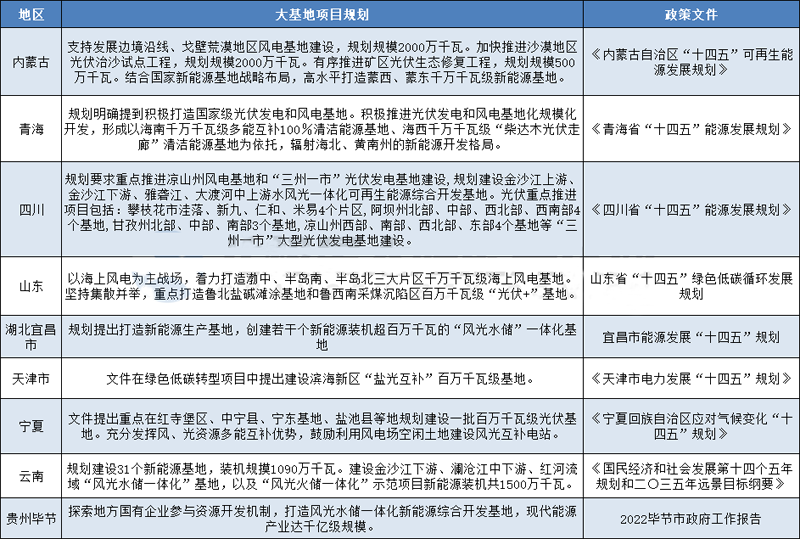 從規(guī)劃項目來看,大基地項目主要集中于三北的沙漠、戈壁、鹽堿灘等地區(qū),土地成本相對較低,可利用特高壓輸送電力,具備成本優(yōu)勢。西南部以云貴川為重點,打造一批水風(fēng)光互補項目,形成以區(qū)域電網(wǎng)為支撐、輸電通道為牽引、以高效消納為目標的項目。除此之外,湖北宜昌市、天津等城市也結(jié)合當(dāng)?shù)厣鷳B(tài),積極規(guī)劃若干百萬千瓦級基地項目。