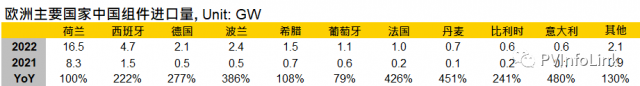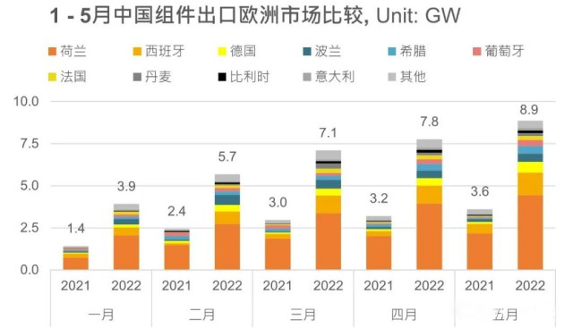 目前中國(guó)主要出口增長(zhǎng)的區(qū)域市場(chǎng),仍是目前能源轉(zhuǎn)型最積極,同時(shí)也因俄羅斯和烏克蘭沖突下能源供應(yīng)不穩(wěn)定而面臨能源危機(jī)的歐洲。歐洲五月從中國(guó)進(jìn)口了8.9GW的光伏組件,同比增長(zhǎng)146%,1-5月則是累計(jì)了33.3GW,同比增長(zhǎng)144%,為各區(qū)域市場(chǎng)中增長(zhǎng)最高。2021年歐洲全年進(jìn)口量已經(jīng)是最高的40.9GW,占中國(guó)2021年出口的46%,在基期已高且今年仍呈現(xiàn)逐月增長(zhǎng)的態(tài)勢(shì)下,印證了歐洲市場(chǎng)對(duì)于光伏產(chǎn)品的需求仍然強(qiáng)勁。