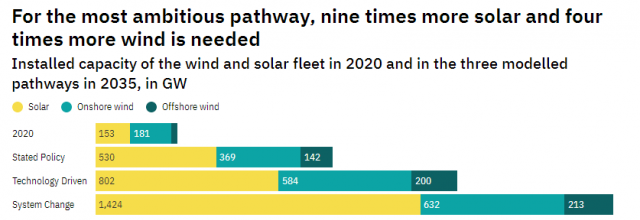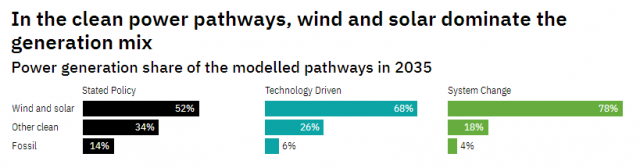 在實(shí)現(xiàn)清潔能源目標(biāo)的發(fā)電組合中,光伏發(fā)電和風(fēng)力發(fā)電占主導(dǎo)地位。在技術(shù)驅(qū)動(dòng)路徑中,光伏發(fā)電和風(fēng)力發(fā)電占總發(fā)電量的68%,在系統(tǒng)變革路徑中占78%。要實(shí)現(xiàn)這些數(shù)字,歐洲各國安裝的光伏發(fā)電和風(fēng)力發(fā)電裝機(jī)容量的年增長率必須是過去十年的四倍,需要安裝1400GW的光伏系統(tǒng)和800GW的風(fēng)電發(fā)電設(shè)施。雖然只有系統(tǒng)變革途徑旨在適應(yīng)淘汰燃煤發(fā)電設(shè)施,但兩者都能看到化石燃料的大幅減少。
