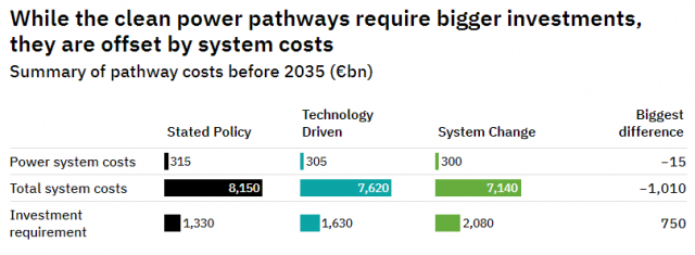 研究表明,雖然實(shí)現(xiàn)清潔能源目標(biāo)的這些路徑需要更大的前期投資,但從長遠(yuǎn)來看,這些投資被減少采用化石燃料的成本所抵消。根據(jù)研究,既定政策路徑的投資將需要13300億歐元,技術(shù)驅(qū)動(dòng)路徑為16300億歐元,系統(tǒng)變革為20800億歐元。到2035年,所有路徑的電力系統(tǒng)成本都相似,但清潔電力路徑的總系統(tǒng)成本將減少5300億歐元至10100億歐元。