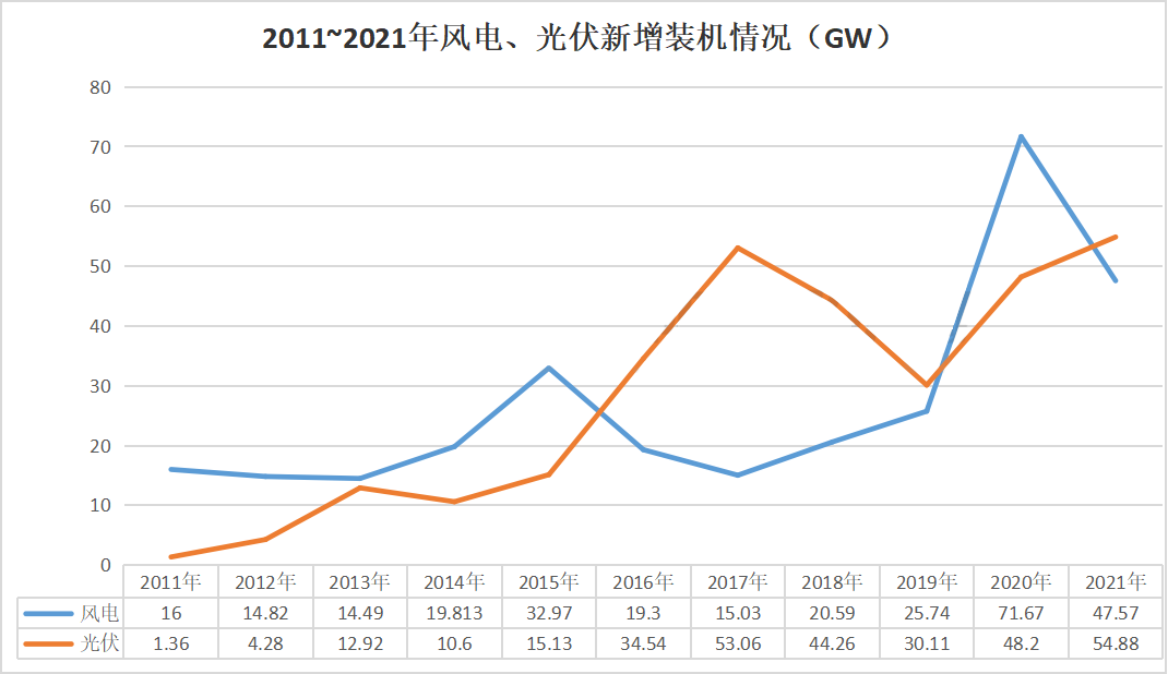 2020年在補貼退坡刺激下,陸上風(fēng)電“搶裝潮”,當(dāng)年風(fēng)電新增裝機以71.67GW創(chuàng)下新高。2021年海上風(fēng)電、戶用光伏補貼“倒計時”,風(fēng)電新增裝機達到47.57GW,光伏新增裝機達到54.88GW。