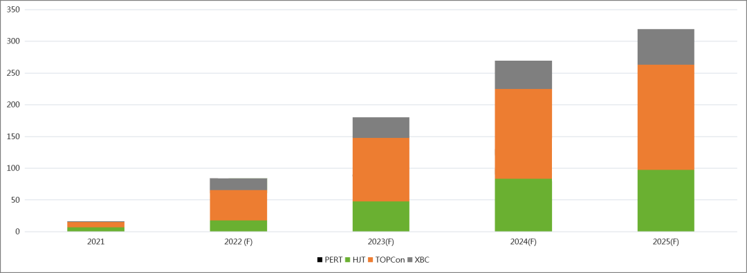 圖:2021年-2025年不同類型N型電池片產(chǎn)能趨勢(shì)