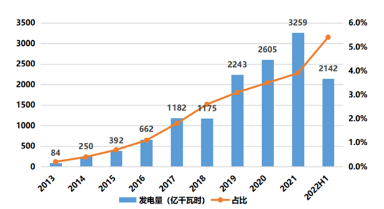 圖1 2013-2022年上半年我國(guó)光伏發(fā)電量情況