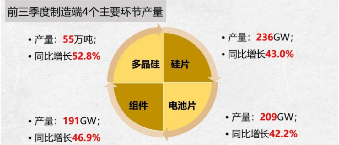 從制造環(huán)節(jié)來看,旺盛的市場需求驅(qū)動制造端強(qiáng)勁增長。前三季度,多晶硅、硅片、組件、電池片4個環(huán)節(jié)的增長速度均超過40%。其中,多晶硅產(chǎn)量55萬噸,同比增長52.8%;硅片產(chǎn)量236GW,同比增長43%;組件產(chǎn)量191GW,同比增長46.9%;電池片產(chǎn)量209GW,同比增長42.2%。