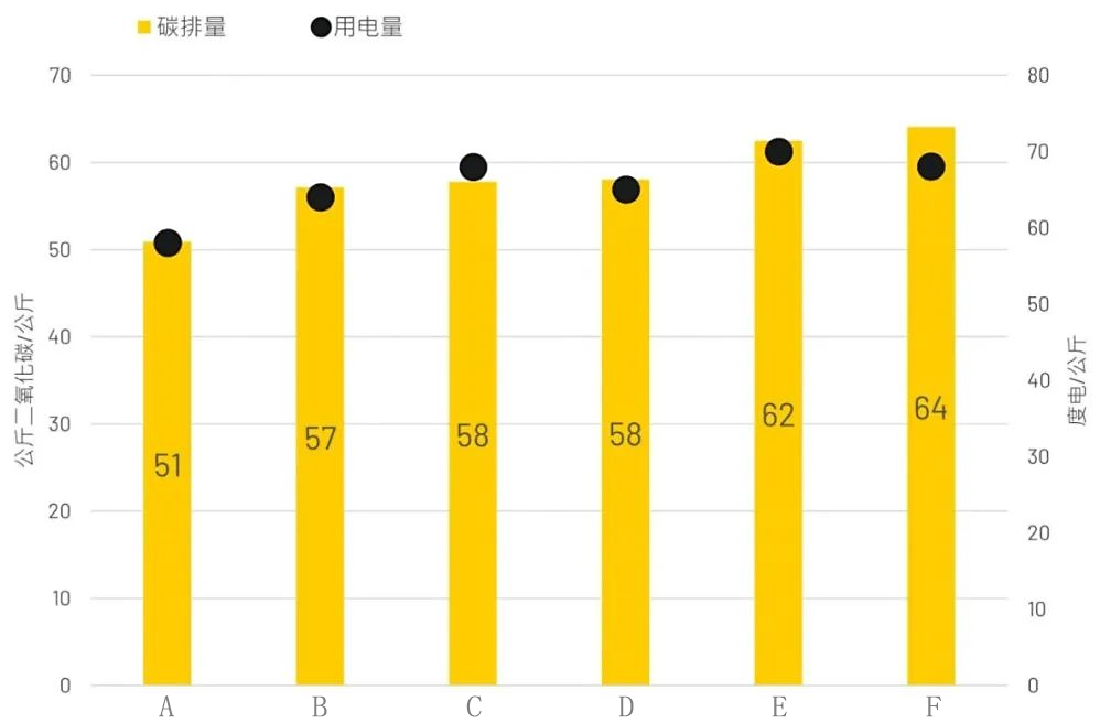 不僅在不同國(guó)家之間進(jìn)行制造的碳排差異大,同國(guó)家之間的各省份因電力來(lái)源的不同也會(huì)出現(xiàn)不小差異,因此企業(yè)在進(jìn)行新一輪擴(kuò)產(chǎn)之前,也應(yīng)將未來(lái)減碳因素納入選址考慮。以硅料重點(diǎn)產(chǎn)區(qū)為例,下方A到F六家企業(yè)分別在內(nèi)蒙古、江蘇、青海、陜西、四川及新疆等地,若僅以每公斤多晶硅的耗電部分測(cè)算所產(chǎn)生的碳排放量,出現(xiàn)雖耗電量較高、但碳排放量卻未高于競(jìng)爭(zhēng)企業(yè)的情形,表示企業(yè)設(shè)廠區(qū)域若使用較干凈的能源,整體碳排放系數(shù)將較有競(jìng)爭(zhēng)優(yōu)勢(shì)。