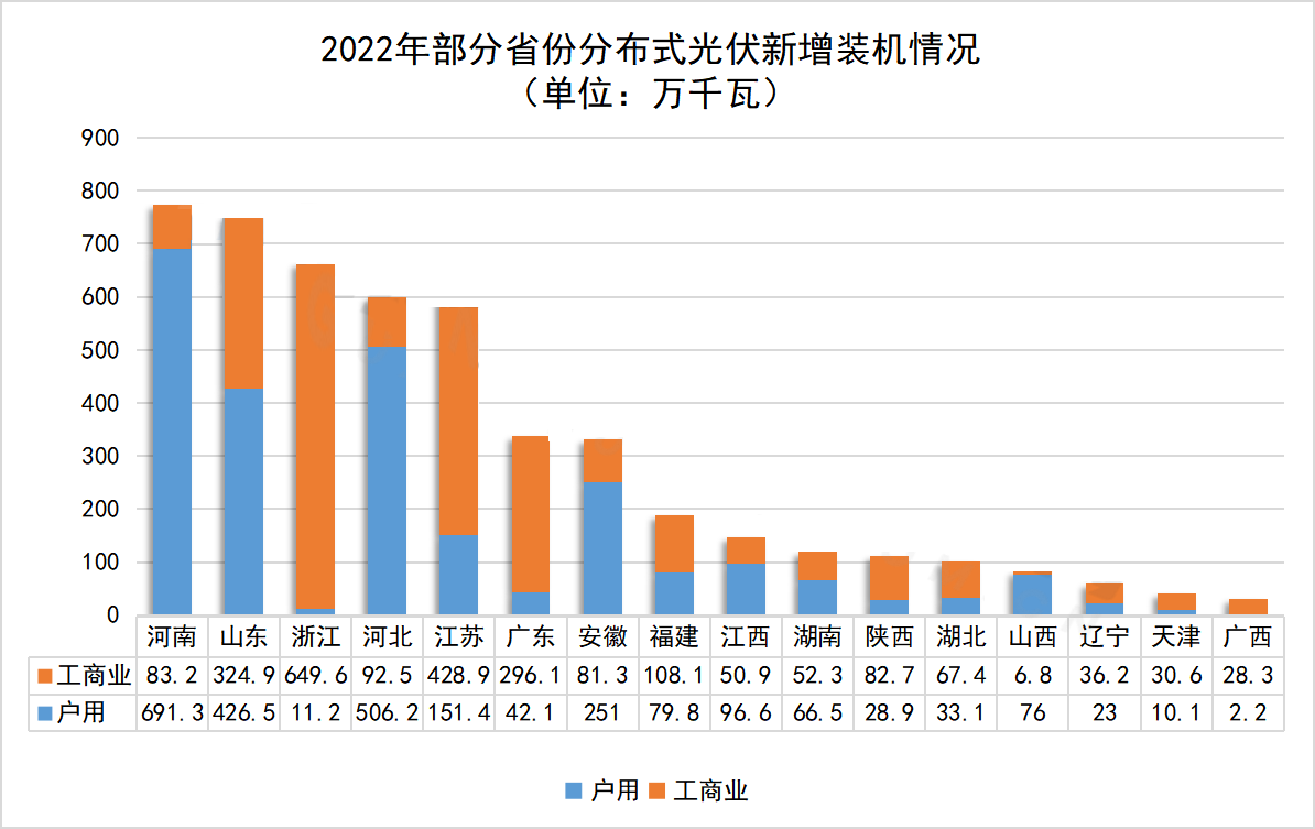 國(guó)家能源局等機(jī)構(gòu)公布的最新數(shù)據(jù)也佐證了這一觀點(diǎn),例如:浙江、江蘇兩個(gè)制造業(yè)、工商業(yè)發(fā)達(dá)省份,2021年分布式光伏新增裝機(jī)尚不足200萬(wàn)千瓦,2022年裝機(jī)數(shù)據(jù)分別攀升至660.8萬(wàn)千瓦和580.3萬(wàn)千瓦,今年一季度,兩省分布式新增裝機(jī)也全部超過(guò)100萬(wàn)千瓦,在國(guó)網(wǎng)區(qū)域內(nèi)位居前列。