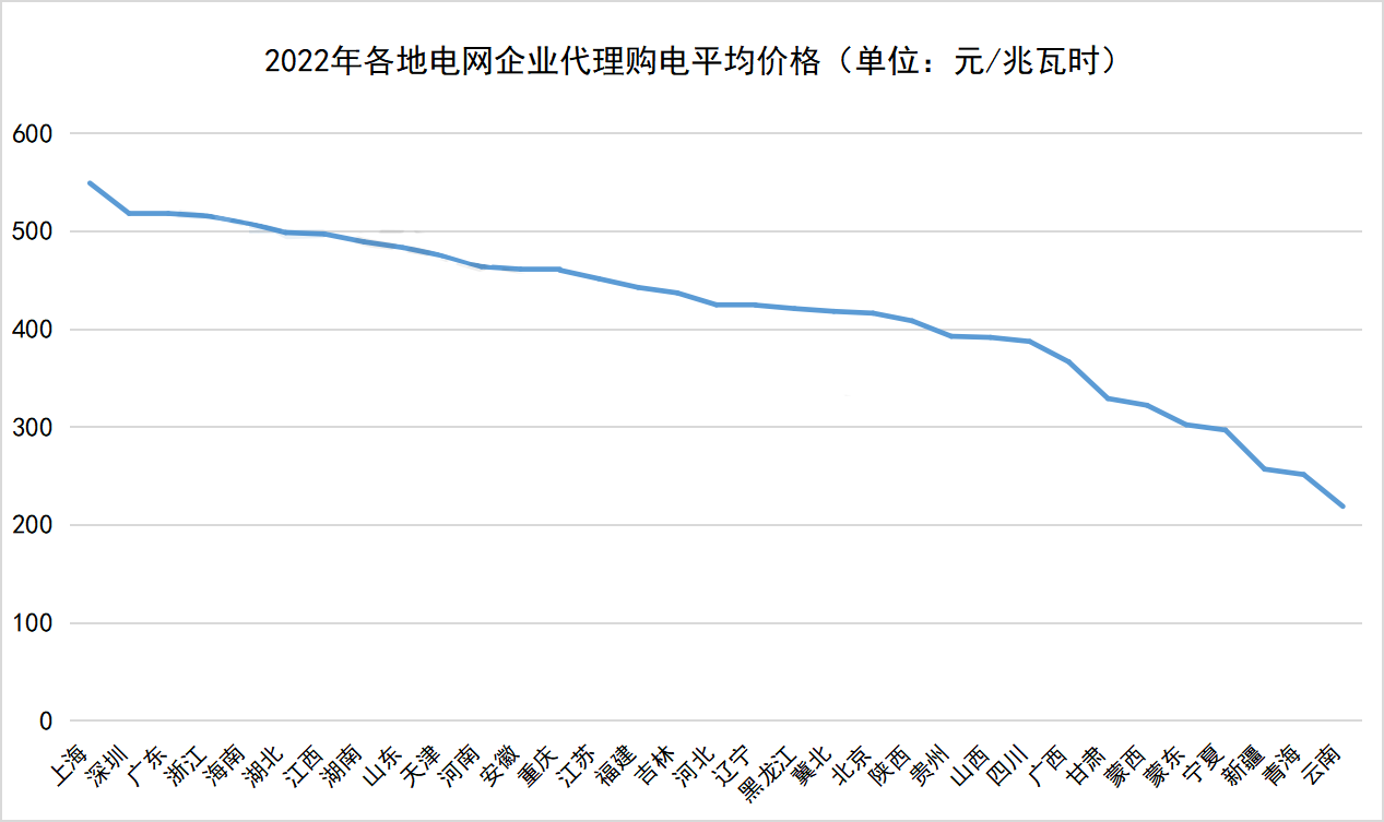 而且東南部地區(qū),一般工商業(yè)、大工業(yè)交易電價(jià)更加高昂。據(jù)北極星售電網(wǎng)統(tǒng)計(jì),2022年1月-12月,全國(guó)平均代購(gòu)電價(jià)格排名前五的地區(qū)分別是上海、廣東、深圳、浙江、海南,全部位于東南部沿海經(jīng)濟(jì)發(fā)達(dá)地區(qū),其平均代購(gòu)電價(jià)格處于500元/兆瓦時(shí)以上。