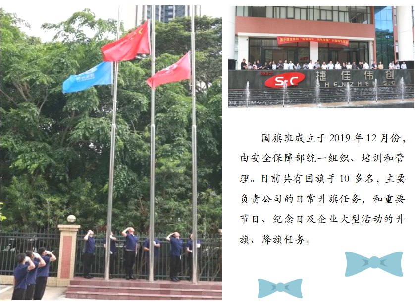 根據(jù)活動議程,參會人員觀看了我司的國旗班升旗儀式。只見國旗班成員肩扛國旗和司旗,雄糾糾氣昂昂地踏著鏗鏘的步伐,整齊劃一地走到旗桿處。隊員將旗幟綁好后,所有人莊嚴地敬禮,唱著國歌,注視國旗緩緩地升到旗桿頂部。國旗班成員訓練有素、作風優(yōu)良,贏得了坪山區(qū)工會領(lǐng)導和各企業(yè)代表的充分肯定和贊揚。