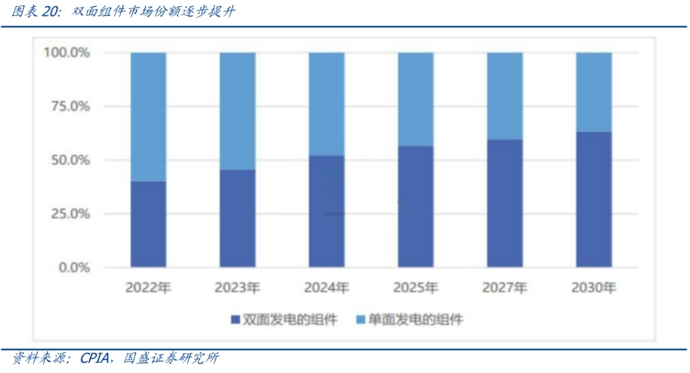 雙玻組件正合N型特性需求,后續(xù)有望隨N型時(shí)代到來而持續(xù)加速滲透。相比單面組件,雙面組件的生命周期更長(zhǎng),耐候性和耐腐蝕性更強(qiáng),衰減低于單面組件;發(fā)電效率更高,正面背面均有發(fā)電能力,背面可接受周圍環(huán)境的反射光、散射光轉(zhuǎn)換為電能,在不同地表材質(zhì)下,雙面組件能夠提高10%-30%的發(fā)電量;除發(fā)電效率更高外,雙面組件還具有生命周期長(zhǎng)、耐候性和耐腐蝕性更強(qiáng)、衰減更慢的優(yōu)點(diǎn),普通組件與雙玻組件質(zhì)保期分別為25/30年,發(fā)電量衰減率分別約0.7%/0.5%。2022年,隨著下游應(yīng)用端對(duì)于雙面發(fā)電組件發(fā)電增益認(rèn)可,雙面組件市場(chǎng)占比達(dá)到40.4%。據(jù)CPIA預(yù)計(jì),2024年雙面組件將超過單面組件成為市場(chǎng)主流。