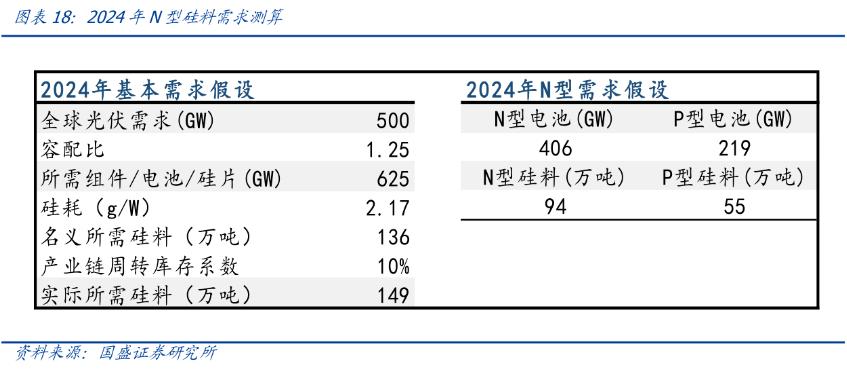 2024年大概率是N型TOPCon電池成為主流光伏電池技術(shù)路線的第一年,假設(shè)明年500GW的全球光伏裝機(jī)需求,按1:1.25的容配比,2.17g/W的硅耗及10%的產(chǎn)業(yè)鏈周轉(zhuǎn)庫存系數(shù)計(jì)算,明年裝機(jī)所需的硅料接近150萬噸。假設(shè)明年N型電池占比達(dá)到65%,則所需N型硅料近95萬噸,P型硅料需求則只有55萬噸,計(jì)算過程如下:
