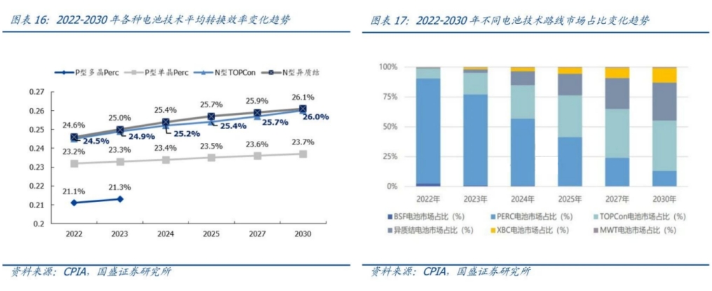 2024年是N型時(shí)代正式提升市占率的一年。如果說2023年是N型量產(chǎn)元年,那么2024年在N型電池片產(chǎn)能逐步落地的情況下,有望成為主流電池路線。根據(jù)CPIA最新統(tǒng)計(jì),N型電池量產(chǎn)轉(zhuǎn)換效率目前已實(shí)現(xiàn)了24%-25%,形成了對(duì)Perc電池1.3pct左右的效率優(yōu)勢(shì),并將在近兩年實(shí)現(xiàn)超2pct的效率領(lǐng)先。因此,預(yù)計(jì)以TOPCon及HJT為主的N型電池路線將逐步提升其市場(chǎng)滲透率,成為未來主流的光伏電池技術(shù)路線。