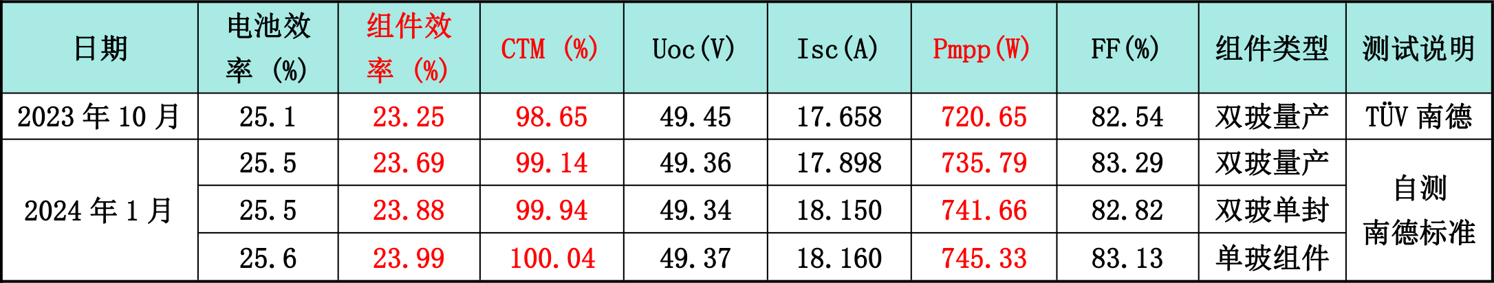 自去年12月最高功率組件達到738.98W以來,經(jīng)過不到一個月持續(xù)優(yōu)化,2024年1月捷佳偉創(chuàng)HJT單玻組件功率達到745.33W,雙玻單封組件741.66W,純雙玻量產(chǎn)組件最高功率735.79W,以上HJT組件電池端均采用12BB印刷工藝,再次刷新公司HJT組件功率記錄!