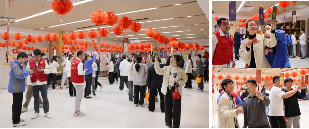 一走進活動現(xiàn)場,大家立刻被歡樂喜慶的氛圍包圍,一個個喜慶的燈籠懸掛著一條條精彩的謎語瞬間吸引了大家的目光。謎語的種類繁多,涵蓋了漢字成語、人名、動物、生活用品、核心價值觀關(guān)鍵詞語等等。參加活動的職工在一條條謎語前,有的凝目沉思,有的幾個人聚在一起,你一言我一語互相幫著解謎,有的猜出了謎語高興得手舞足蹈,也有的手指在手上劃來劃去勾勒答案。猜中了謎底的同事,與現(xiàn)場工作人員核對后,就可以拿著謎條前往兌獎區(qū)領(lǐng)取“好柿發(fā)生”禮盒一份,活動現(xiàn)場熱鬧非凡。