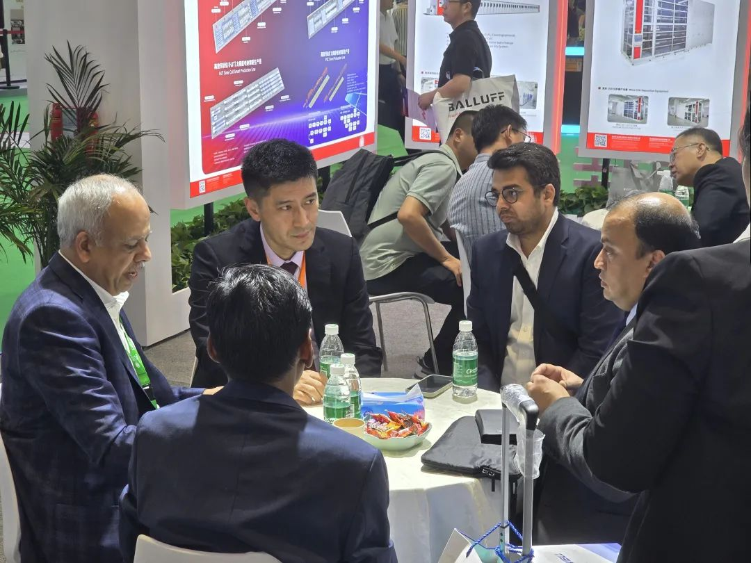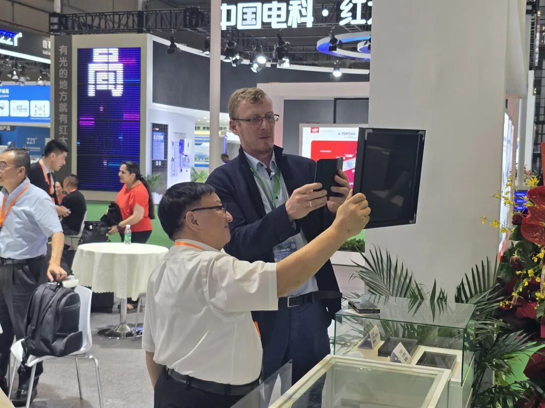 展會(huì)期間,到我司展位現(xiàn)場洽談業(yè)務(wù)、交流技術(shù)的國內(nèi)外客戶、供應(yīng)商及專業(yè)觀眾絡(luò)繹不絕。本次展會(huì),我司還展示了鈣鈦礦中試線的最新成果——由我司設(shè)備制成的300*300鈣鈦礦電池、210半片HJT鈣鈦礦疊層電池、210半片TOPCon鈣鈦礦疊層電池。這些樣品的展出,讓觀眾們更直觀地看到我司整線鈣鈦礦及鈣鈦礦疊層技術(shù)的設(shè)備研發(fā)及電池工藝實(shí)力。