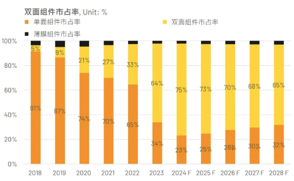 回顧2023年,N型組件的市占率逐漸超越P型組件,但鑒于當(dāng)時N型單面組件存在阻水性與可靠性方面的疑慮,導(dǎo)致去年近乎90%的N型組件均采用雙面設(shè)計,市占率在去年來到約64%,而其中約有3%為雙面單玻組件,單面組件市占率則約為34%。
