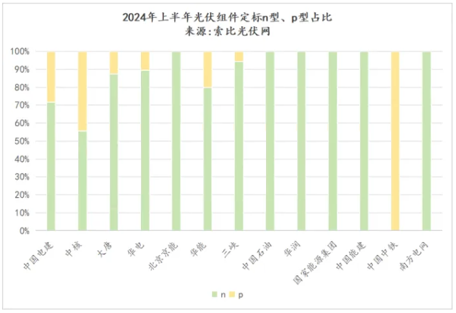 據(jù)電力設(shè)計院專家介紹,在下游應(yīng)用環(huán)節(jié),n型組件高效率、高功率、高雙面率、高發(fā)電量、低LCOE等優(yōu)勢已得到廣泛認(rèn)可。索比光伏網(wǎng)統(tǒng)計數(shù)據(jù)顯示,2024年上半年光伏組件公開招標(biāo)規(guī)模超過172GW,同比增長40%。通過分析各企業(yè)的組件招標(biāo)型號可以看出,n型技術(shù)已占據(jù)絕對主導(dǎo)地位,整體占比超過八成,部分招標(biāo)中甚至已達(dá)到100%。