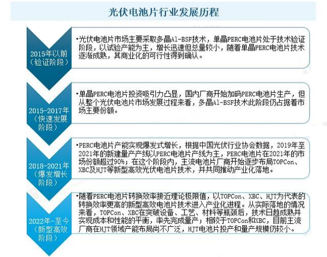 降本增效是推動(dòng)光伏行業(yè)不斷發(fā)展的內(nèi)在牽引動(dòng)力,隨著光伏各個(gè)產(chǎn)業(yè)鏈的日趨成熟,光伏電池片作為光電轉(zhuǎn)換效率的決定性影響因素,是現(xiàn)階段光伏產(chǎn)業(yè)鏈最核心的技術(shù)變革領(lǐng)域。光伏電池片的技術(shù)迭代與光伏設(shè)備的技術(shù)演進(jìn)以及應(yīng)用相互推動(dòng)和成就,共同推動(dòng)光伏電池片生產(chǎn)的降本增效。從光伏電池片的技術(shù)發(fā)展和迭代來看,整體可分為驗(yàn)證、快速發(fā)展、爆發(fā)增長(zhǎng)與新型高效四個(gè)階段。