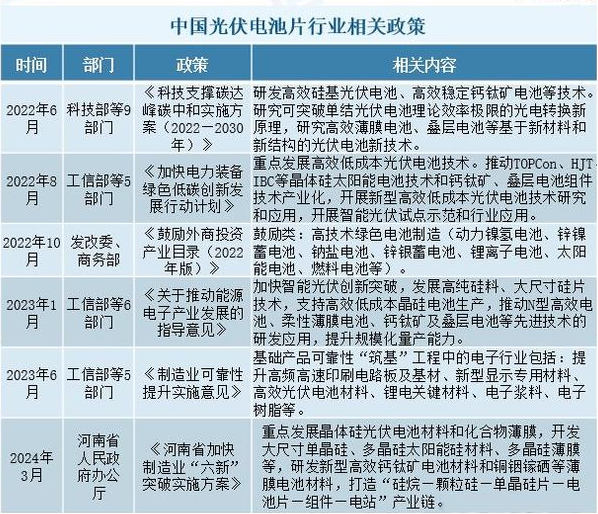 我國(guó)政府高度重視光伏產(chǎn)業(yè)的發(fā)展,先后制定了一系列電價(jià)、補(bǔ)貼、稅收、發(fā)展規(guī)劃等相關(guān)的政策,極大程度上加速了我國(guó)光伏產(chǎn)業(yè)的發(fā)展。我國(guó)政府對(duì)可再生能源的重視以及優(yōu)化能源結(jié)構(gòu)的決心。政府不斷加大對(duì)可再生能源的投資力度,無疑是對(duì)光伏產(chǎn)業(yè)釋放出利好信號(hào)。2023年6月,工信部等5部門印發(fā)《制造業(yè)可靠性提升實(shí)施意見》,提出基礎(chǔ)產(chǎn)品可靠性“筑基”工程中的電子行業(yè)包括:提升高頻高速印刷電路板及基材、新型顯示專用材料、高效光伏電池材料、鋰電關(guān)鍵材料、電子漿料、電子樹脂等。2024年3月,河南省人民政府辦公廳印發(fā)《河南省加快制造業(yè)“六新”突破實(shí)施方案》,提出要重點(diǎn)發(fā)展晶體硅光伏電池材料和化合物薄膜,開發(fā)大尺寸單晶硅、多晶硅太陽能硅材料、多晶硅薄膜等,研發(fā)新型高效鈣鈦礦電池材料和銅銦鎵硒等薄膜電池材料,打造“硅烷—顆粒硅—單晶硅片—電池片—組件—電站”產(chǎn)業(yè)鏈。