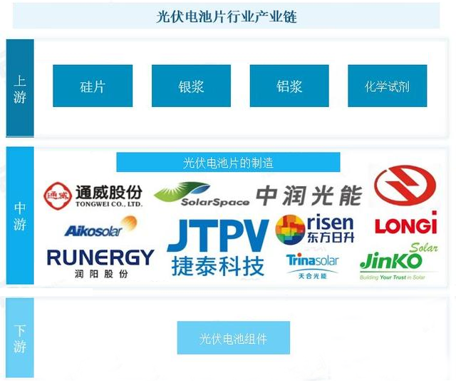 從光伏電池片產(chǎn)業(yè)鏈上游來看,電池片主要原材料為硅片,主要輔材為銀漿、鋁漿和化學(xué)試劑,主要?jiǎng)恿殡娏Α墓夥姵仄a(chǎn)業(yè)鏈下游來看,電池片主要與光伏玻璃、其他封裝材料(背板、EVA膠膜等)共同封裝形成光伏電池組件,組件再與逆變器、支架等共同構(gòu)成光伏電站發(fā)電系統(tǒng)。