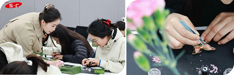 隨后,五十位“佳人”齊聚培訓室,開啟一場關(guān)于非遺螺鈿DIY的活動。公司特別邀請了螺鈿非遺傳承人,帶領(lǐng)大家體驗這一古老而精致的手工藝。