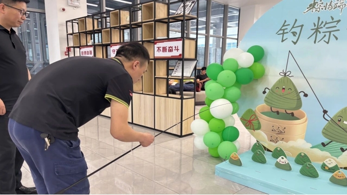 用特制的“魚竿”釣起一個(gè)個(gè)迷你粽子,既考驗(yàn)?zāi)托挠殖錆M樂趣,不少員工直呼“比釣魚還有意思”!