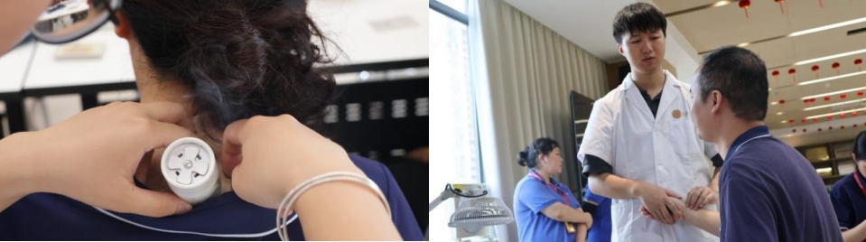 推拿、艾灸、電磁波治療體驗(yàn)區(qū),恰似現(xiàn)代版“醫(yī)館療愈角”。推拿師以嫻熟手法,精準(zhǔn)松解員工因久坐形成的肩頸、腰背結(jié)節(jié),如同拂去職場(chǎng)塵埃,超百人次體驗(yàn)后直言“僵硬的筋骨像被重新喚醒”;艾灸借三伏天時(shí),將艾草溫?zé)崴腿氪笞怠⒆闳锏妊ㄎ?,?qū)寒除濕,不少員工笑言“灸后渾身暖透,連空調(diào)房的濕氣都似被趕跑”;電磁波治療輔助緩解肩頸不適,傳統(tǒng)與科技交織,為健康續(xù)航。