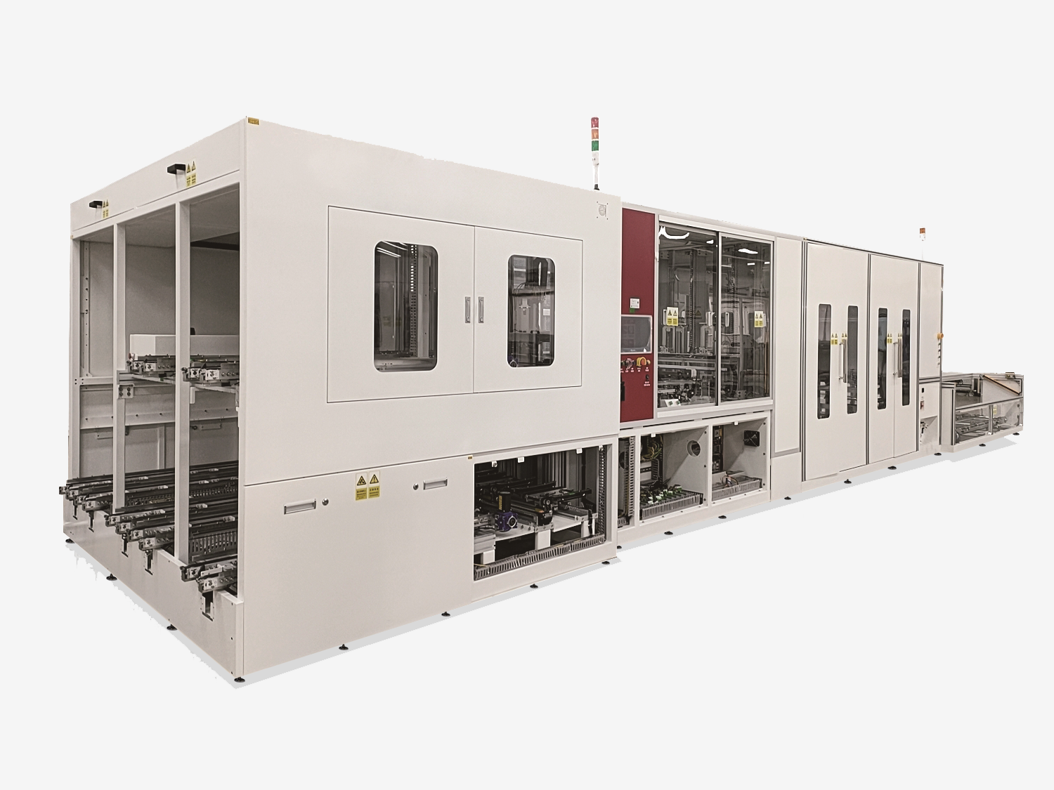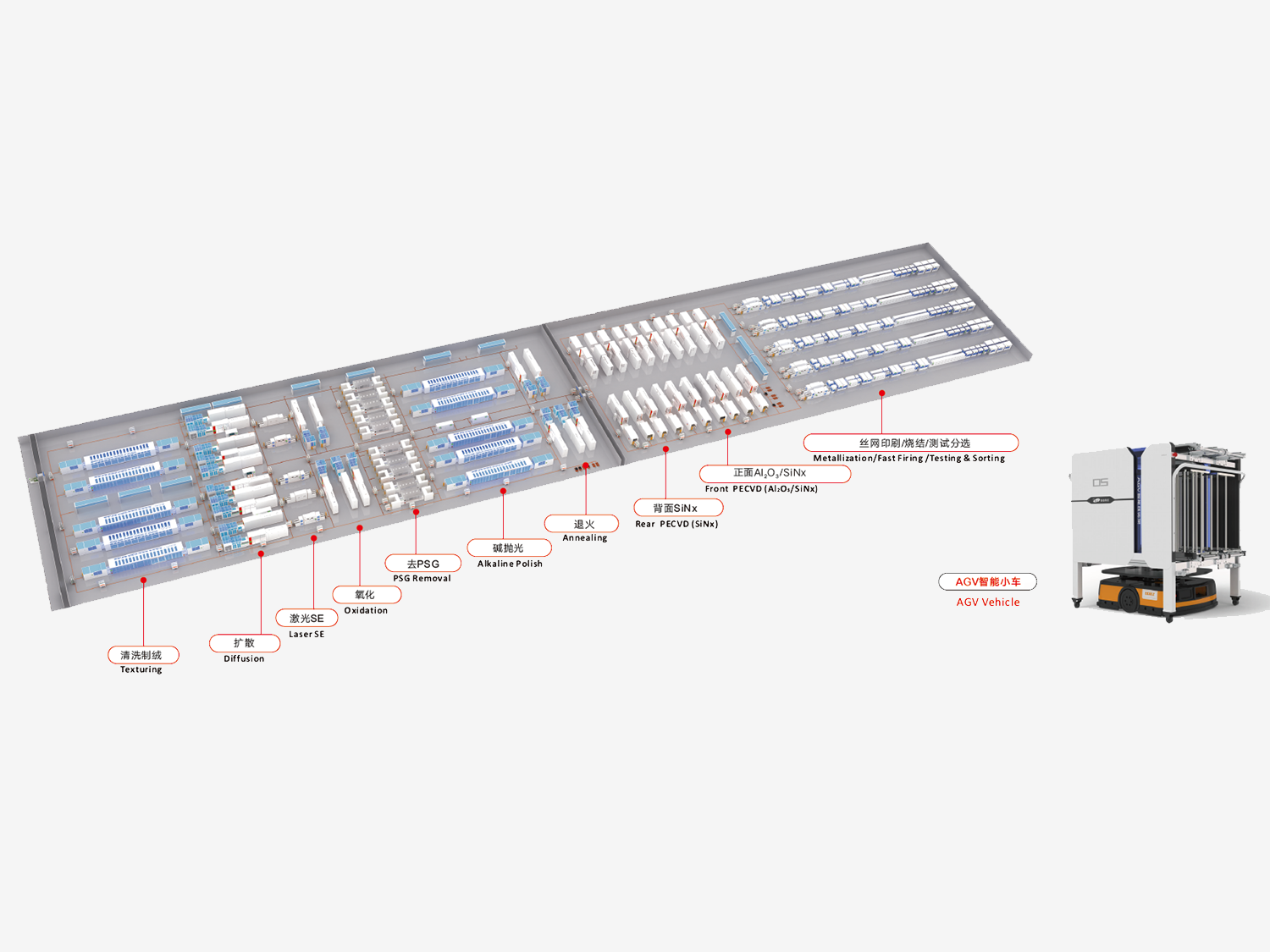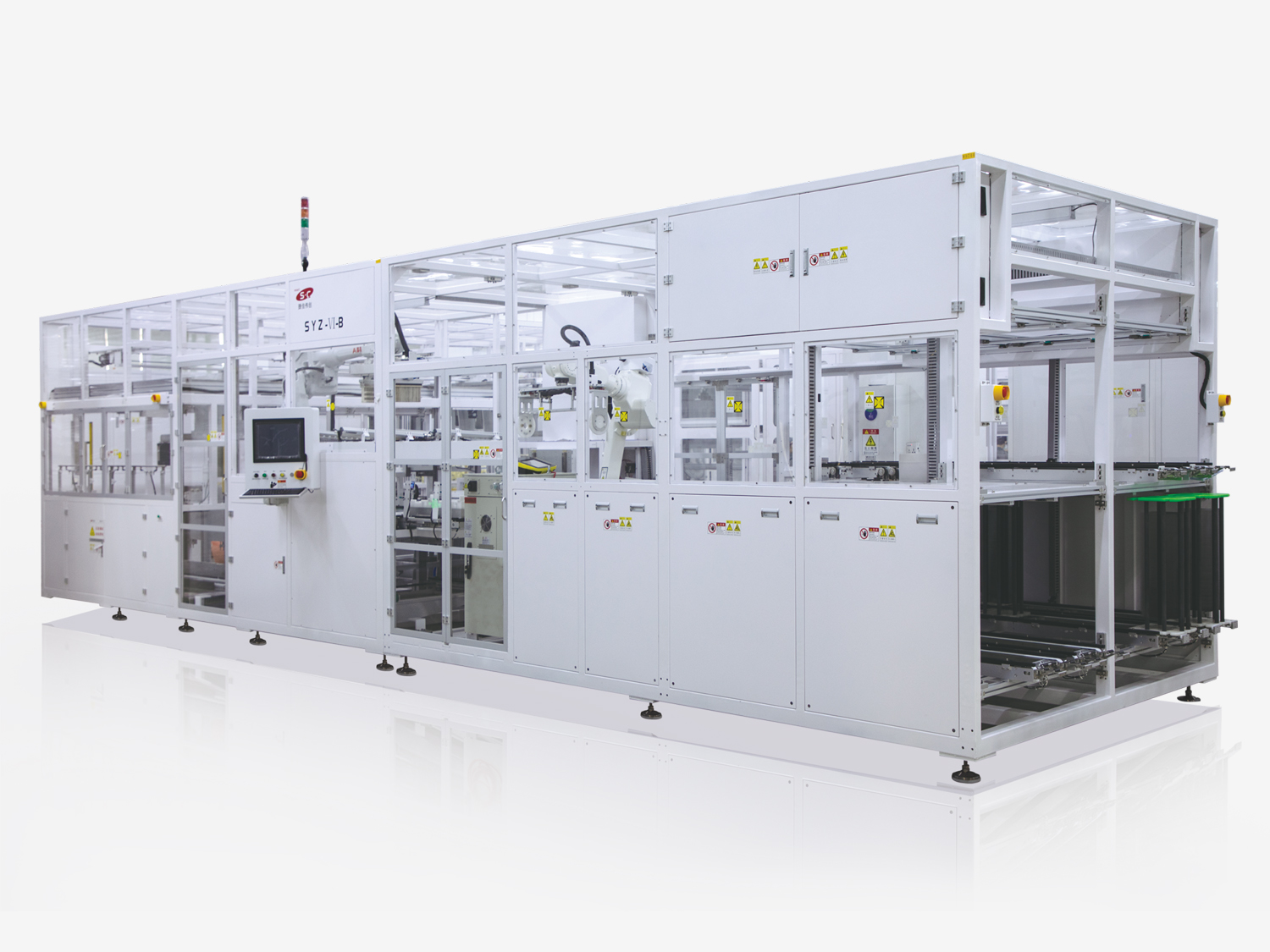 本設(shè)備為在線(xiàn)式,可與一臺(tái)或兩臺(tái)側(cè)出舟設(shè)備對(duì)接,實(shí)現(xiàn)石墨舟的自動(dòng)傳輸和硅片自動(dòng)裝卸,滿(mǎn)足在太陽(yáng)能電池片生產(chǎn)過(guò)程中的PECVD工藝前后,將片籃中的硅片自動(dòng)裝載到石墨舟,并將石墨舟輸送到PECVD設(shè)備中,或?qū)ECVD設(shè)備中的石墨舟輸送到本設(shè)備,并將石墨舟中的硅片自動(dòng)裝載到片籃中。