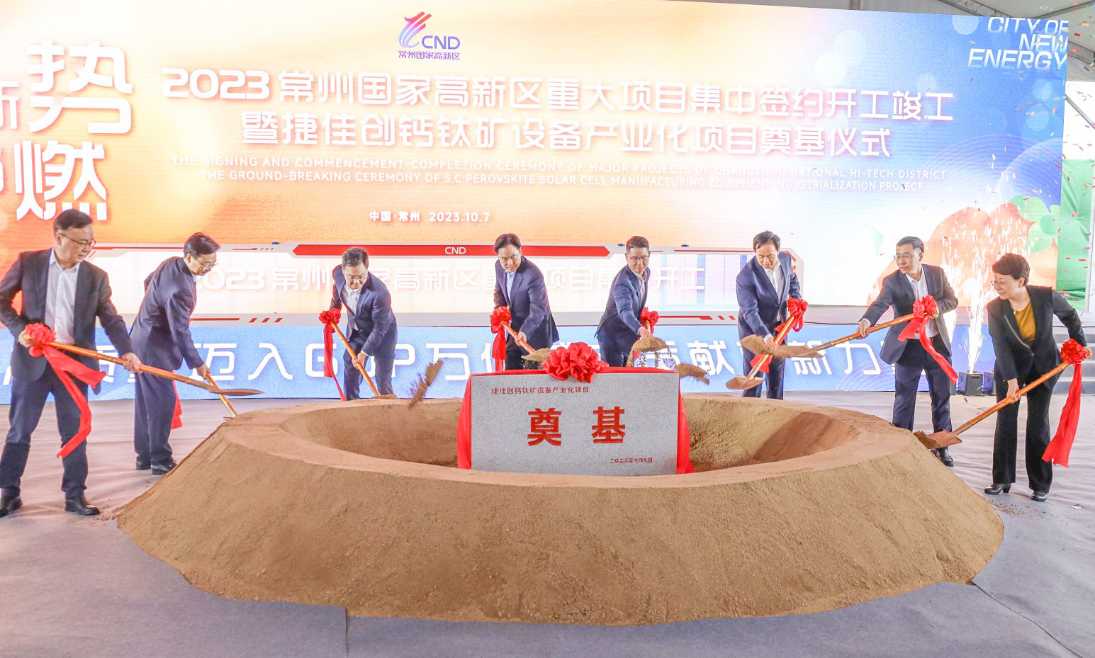 On the morning of October 7th, the 2023 Signing and Commencement-Completion Ceremony of Major Projects of Changzhou National High-tech District &The Ground-breaking Ceremony of S.C Perovskite Solar Cell Manufacturing Equipment Industrialization Project was held at Changzhou S.C Exact Equipment Co., Ltd., and 115 major projects were signed, commencement and completed. Mr. Chen Jinhu, Secretary of the Changzhou Municipal Committee, witnessed the signing and commencement. Mr. Zuo Guojun, Vice Chairman of Shenzhen S.C and General Manager of Changzhou S.C, together with leaders of Changzhou Government, laid the foundation for the Changzhou S.C Perovskite Solar Cell Manufacturing Equipment Industrialization Project.