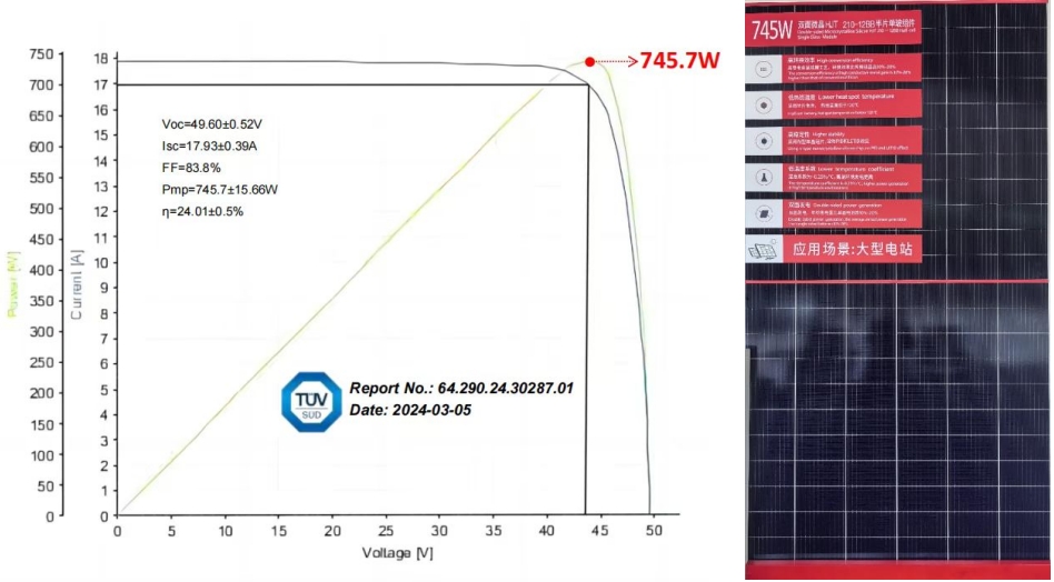 Certified by TüV SüD, an authoritative third-party testing organization, S.C's G12-132 model heterojunction (HJT) high-power solar module has reached a power of 745.7W. This is yet another breakthrough for S.C in the field of HJT since S.C's mass-produced double glass module reached 735.79W in January this year.