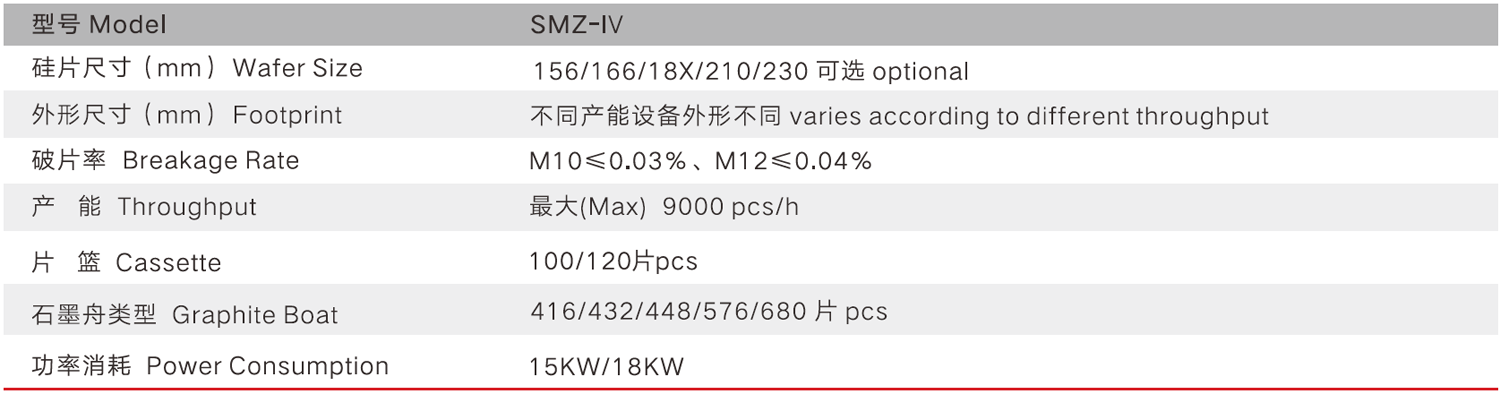 本設(shè)備為在線式,可與一臺或兩臺側(cè)出舟設(shè)備對接,實現(xiàn)石墨舟的自動傳輸和硅片自動裝卸,滿足在太陽能電池片生產(chǎn)過程中的PECVD工藝前后,將片籃中的硅片自動裝載到石墨舟,并將石墨舟輸送到PECVD設(shè)備中,或?qū)ECVD設(shè)備中的石墨舟輸送到本設(shè)備,并將石墨舟中的硅片自動裝載到片籃中。