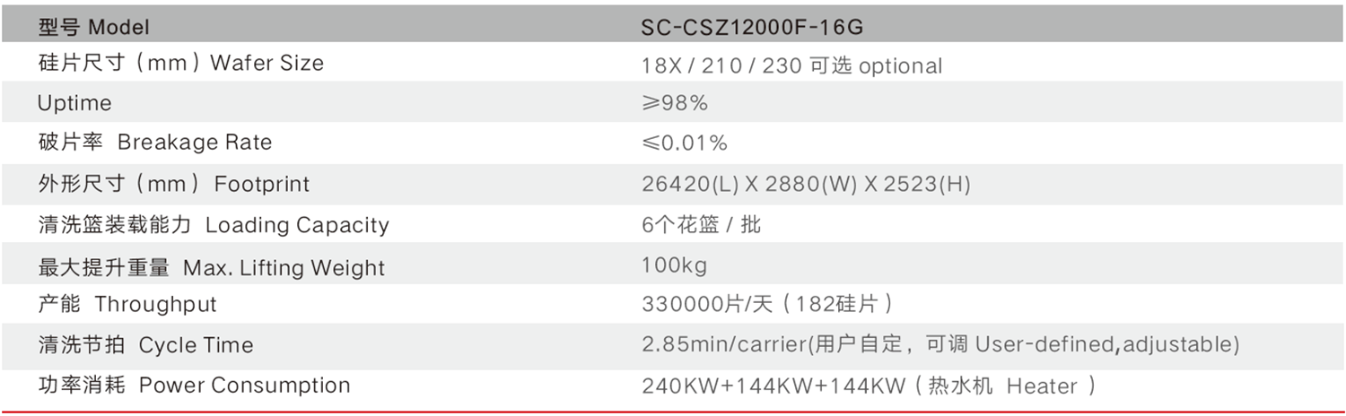 Throughput:600pcs/batch,12000pcs/h——210 wafer(100pcs cassette),720pcs/batch,15000pcs/h——182 wafer(120pcs cassette).